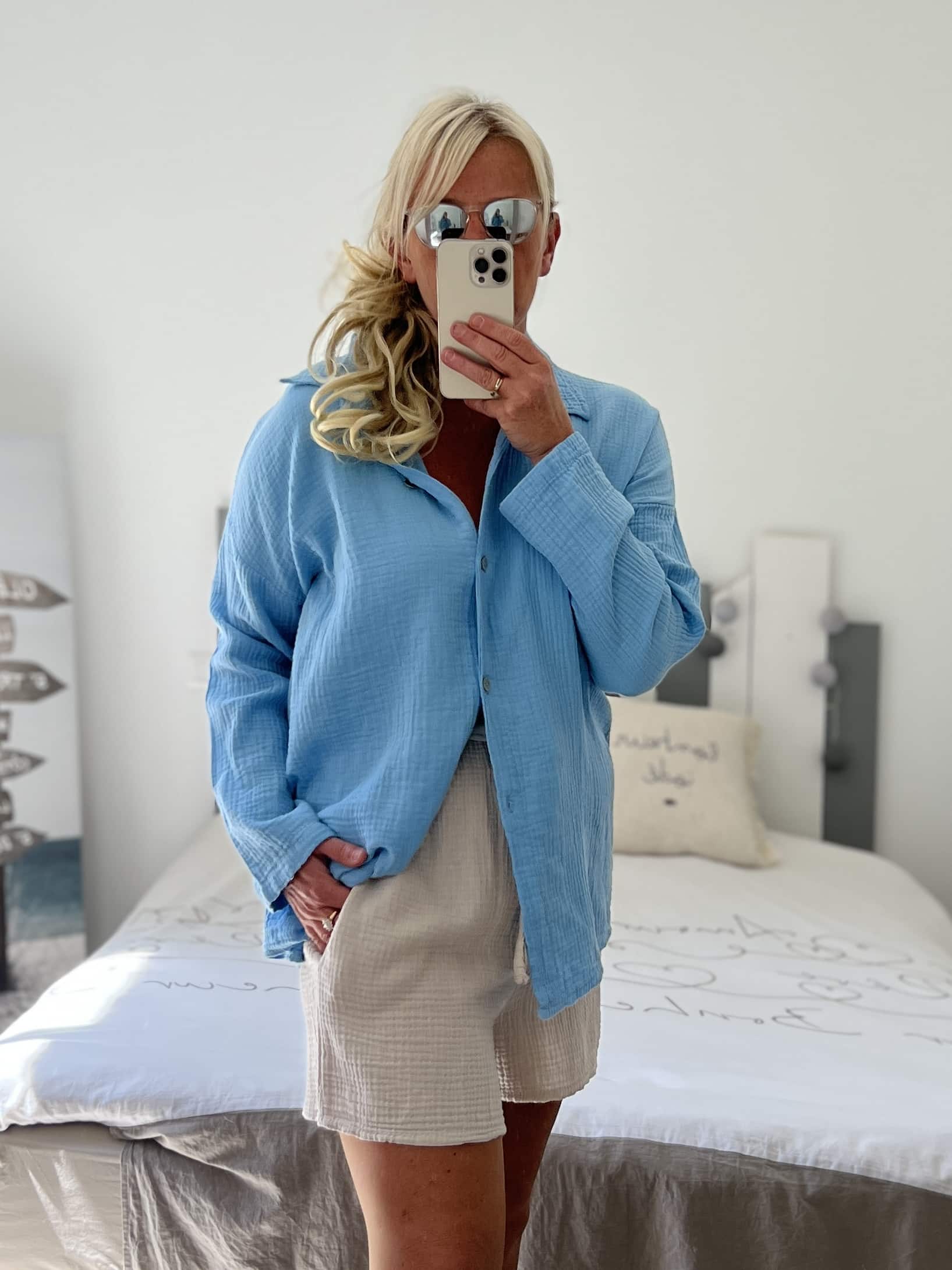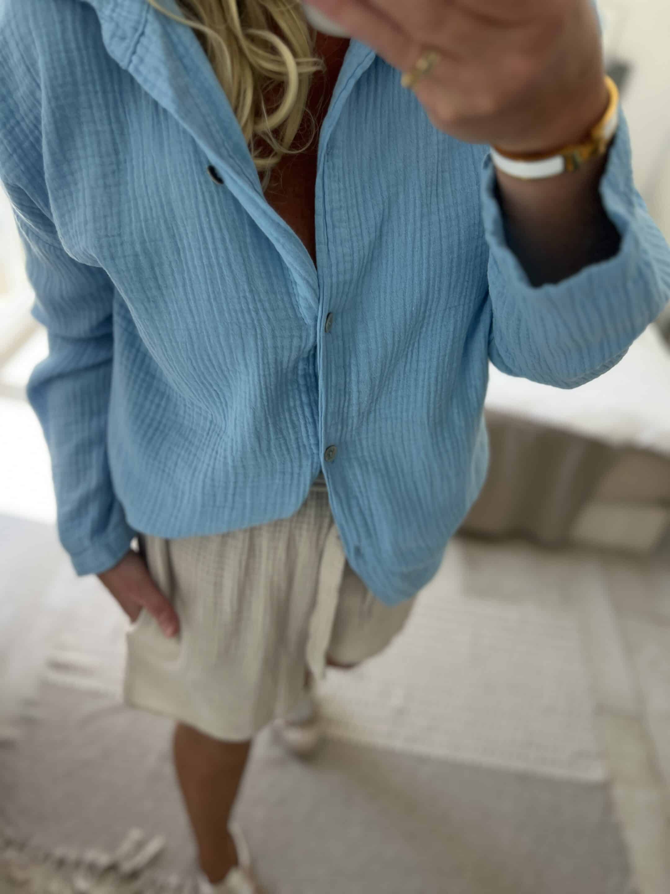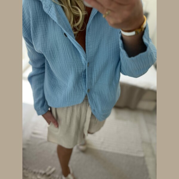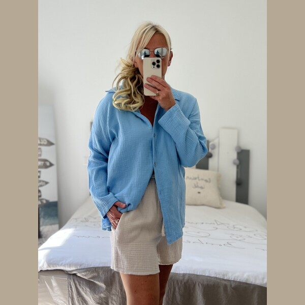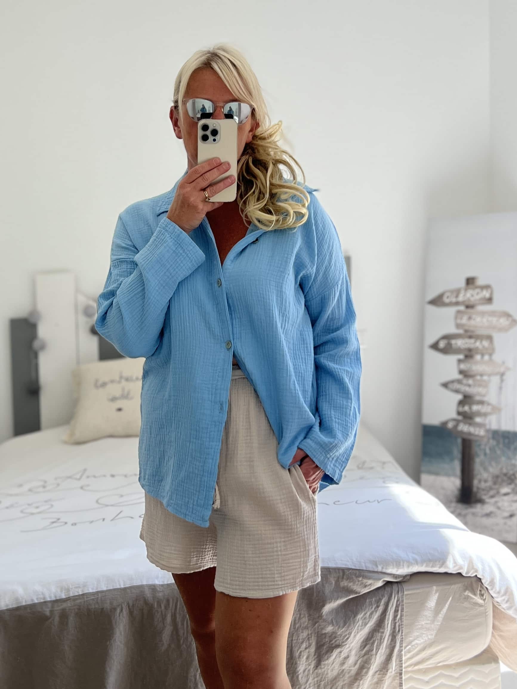 Matière : 100% Coton. Taille Unique : (36-42). Détails : Chemise à manches longues confectionnée dans une double gaze de coton, offrant un fini naturellement gaufré et une texture très douce. Elle présente une coupe oversize avec des emmanchures tombantes pour un style décontracté. Le modèle dispose d’un col classique, d’une fermeture boutonnée contrastante et d’une base arrondie. Une pièce basique, légère et intemporelle, indispensable pour une garde-robe d’été.
