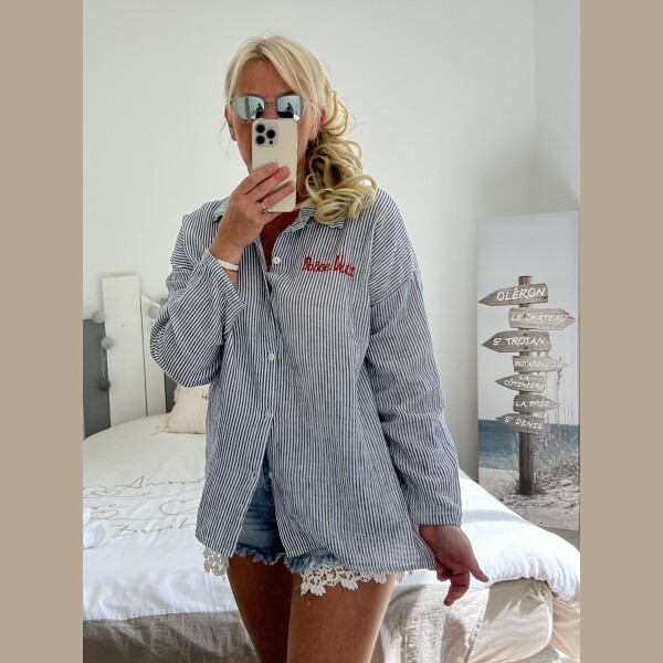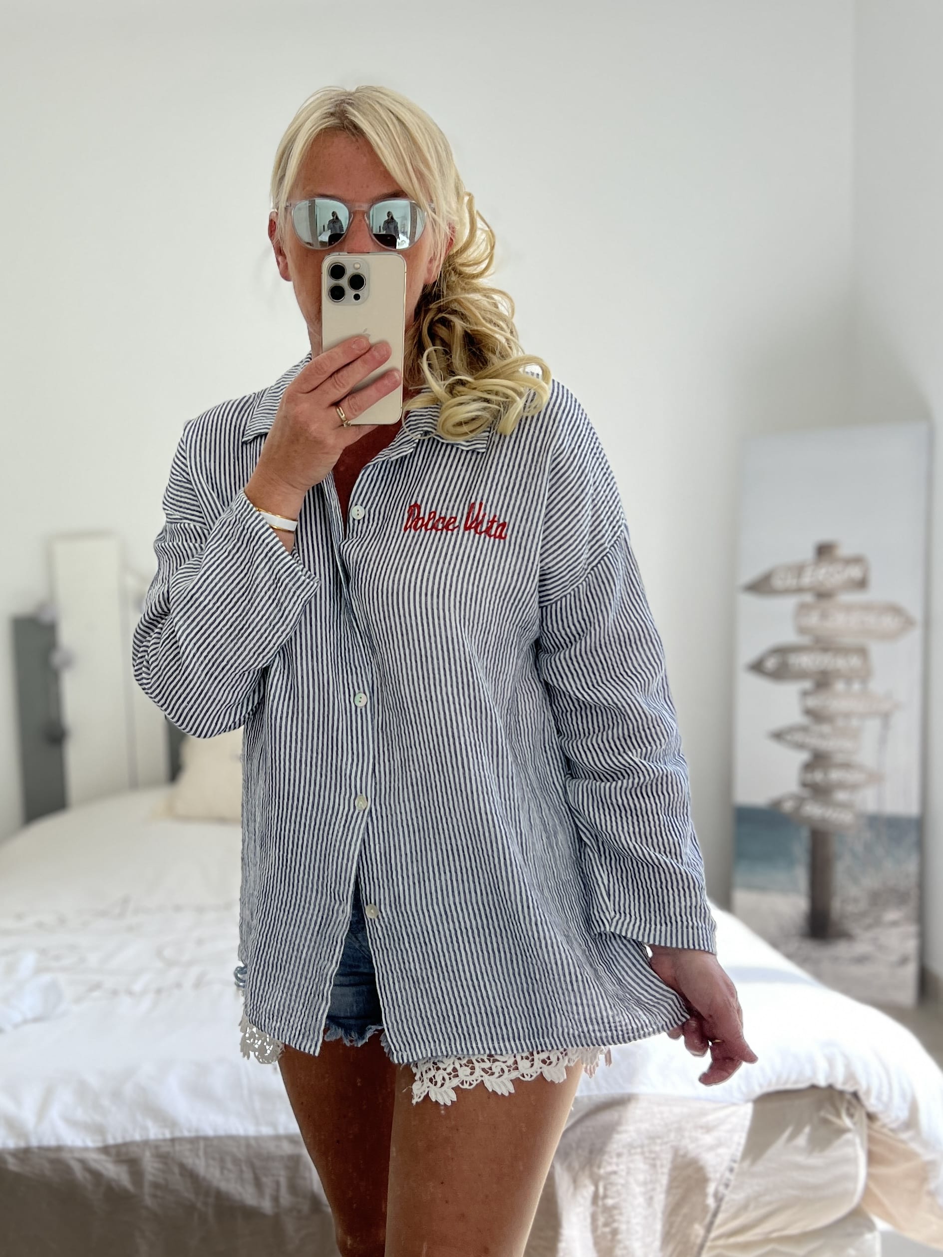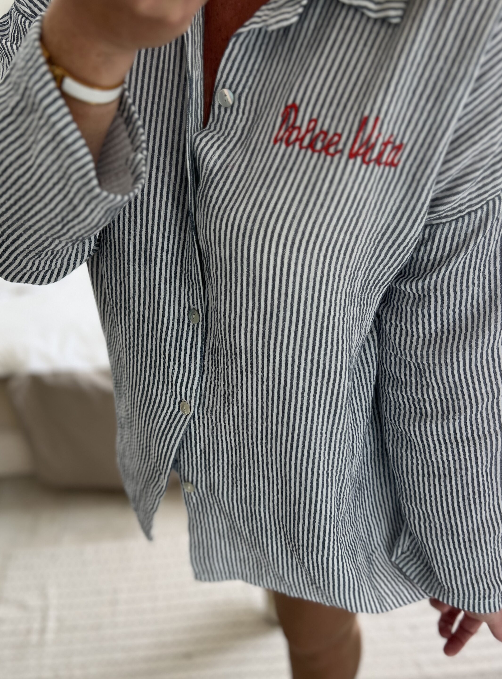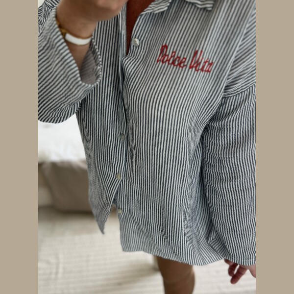 Détails : Chemise boutonnée à manches longues, coupe ample et décontractée. Réalisée en gaze de coton, un tissu léger, aéré et naturellement texturé, parfait pour les journées chaudes. Elle présente un motif à fines rayures verticales. Le col chemise est classique. Une broderie « Dolce Vita » en écriture manuscrite orne la poitrine gauche, ajoutant une touche de fantaisie chic.