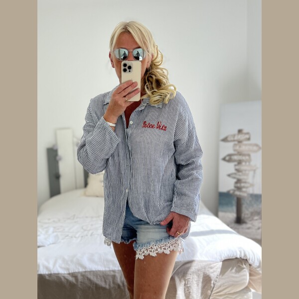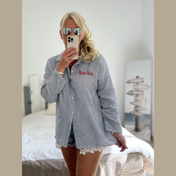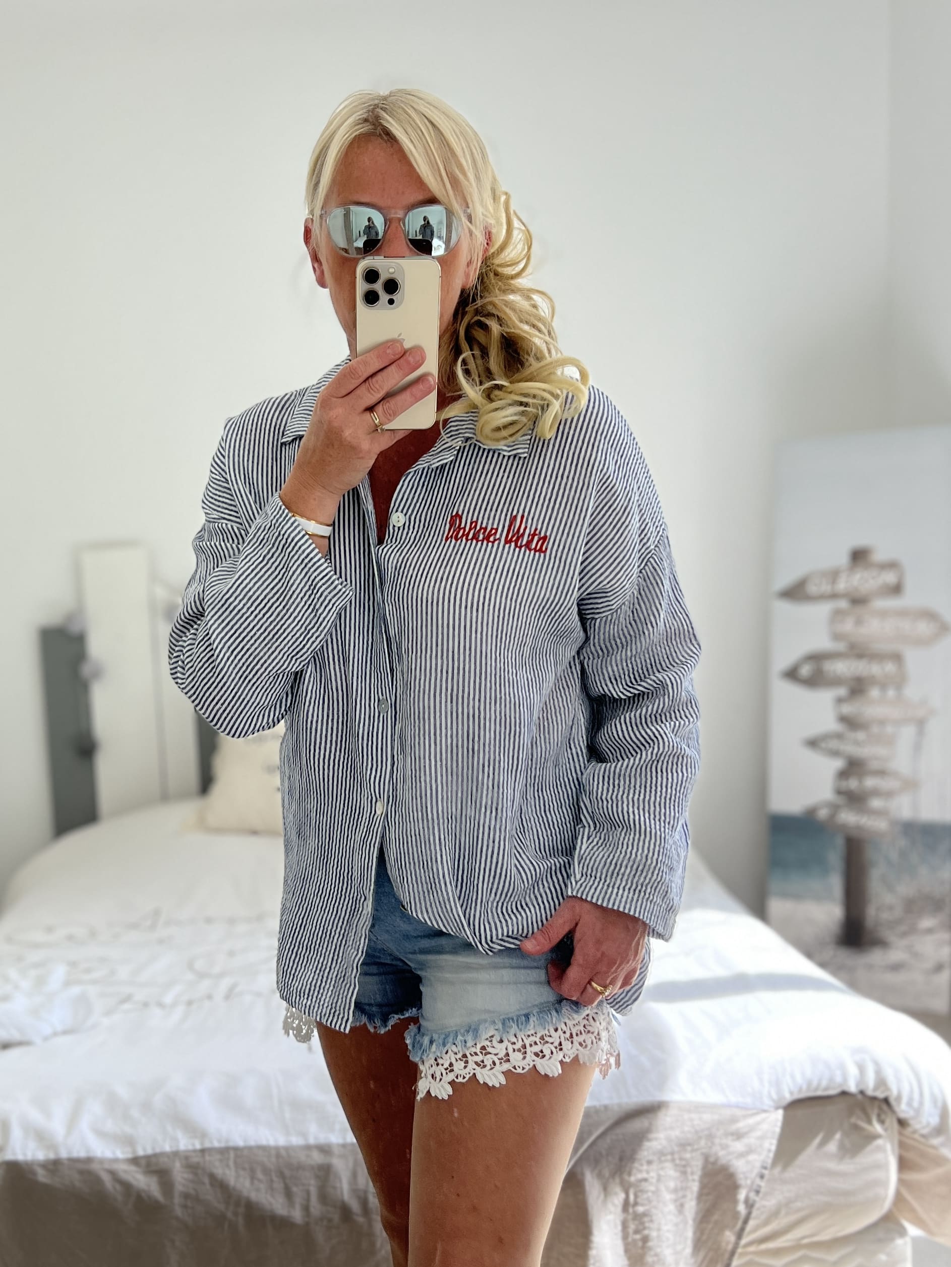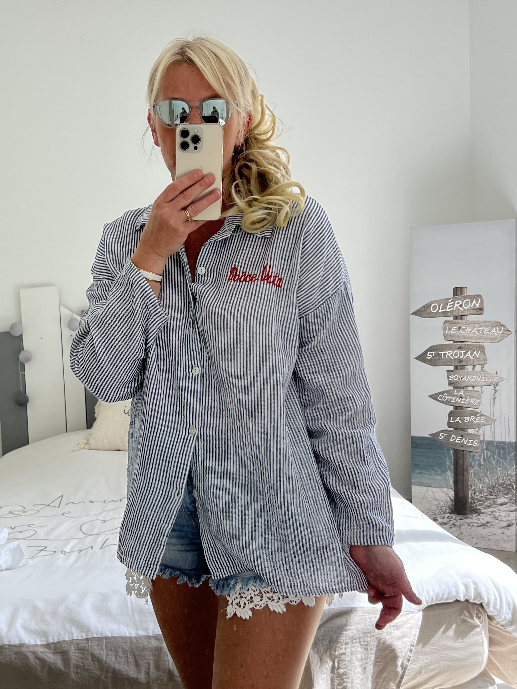 Détails : Chemise boutonnée à manches longues, coupe ample et décontractée. Réalisée en gaze de coton, un tissu léger, aéré et naturellement texturé, parfait pour les journées chaudes. Elle présente un motif à fines rayures verticales. Le col chemise est classique. Une broderie « Dolce Vita » en écriture manuscrite orne la poitrine gauche, ajoutant une touche de fantaisie chic.