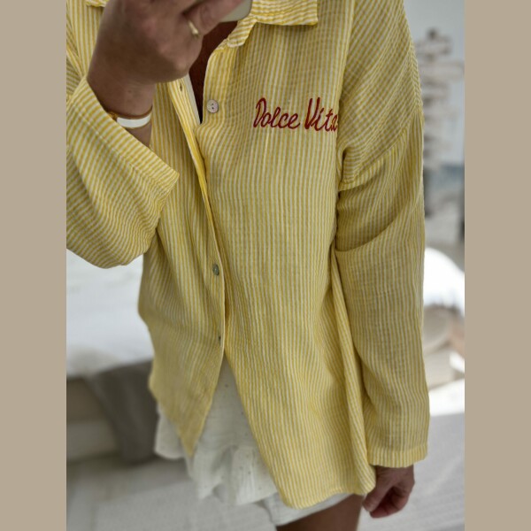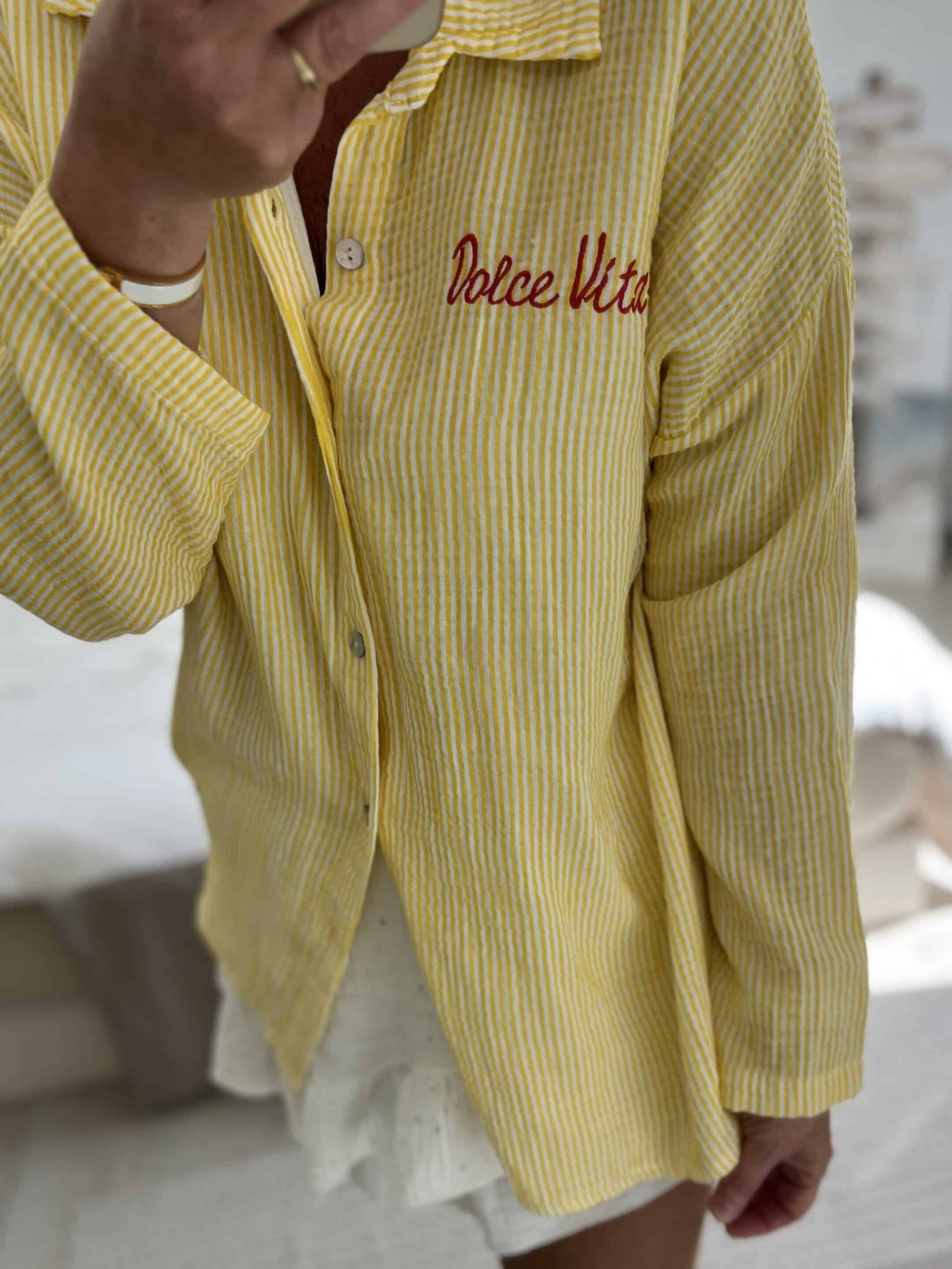 Détails : Chemise boutonnée à manches longues, coupe ample et décontractée. Réalisée en gaze de coton, un tissu léger, aéré et naturellement texturé, parfait pour les journées chaudes. Elle présente un motif à fines rayures verticales. Le col chemise est classique. Une broderie « Dolce Vita » en écriture manuscrite orne la poitrine gauche, ajoutant une touche de fantaisie chic.
