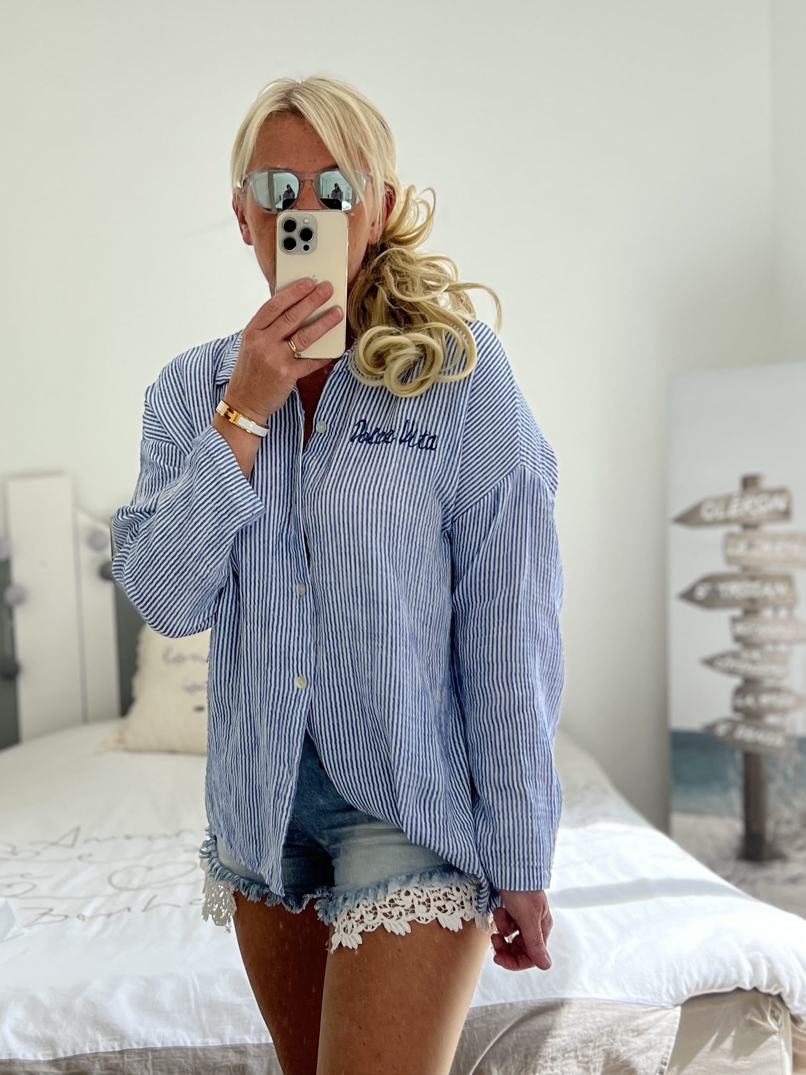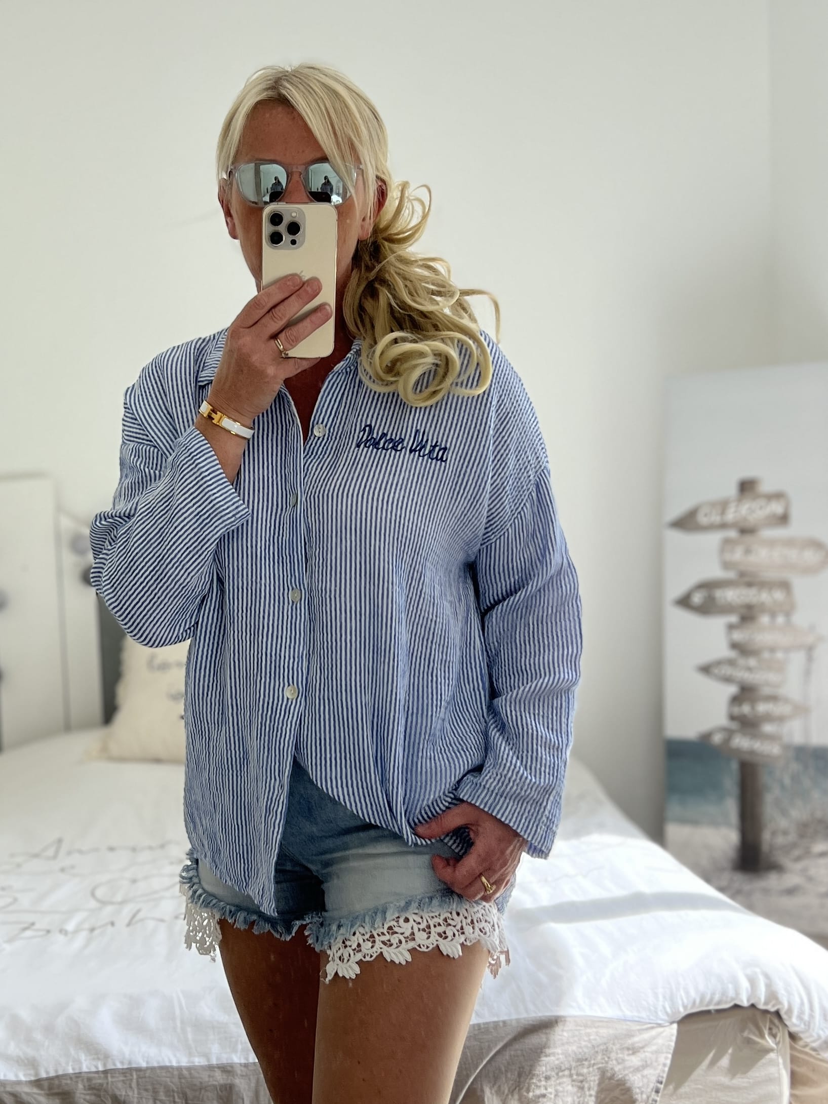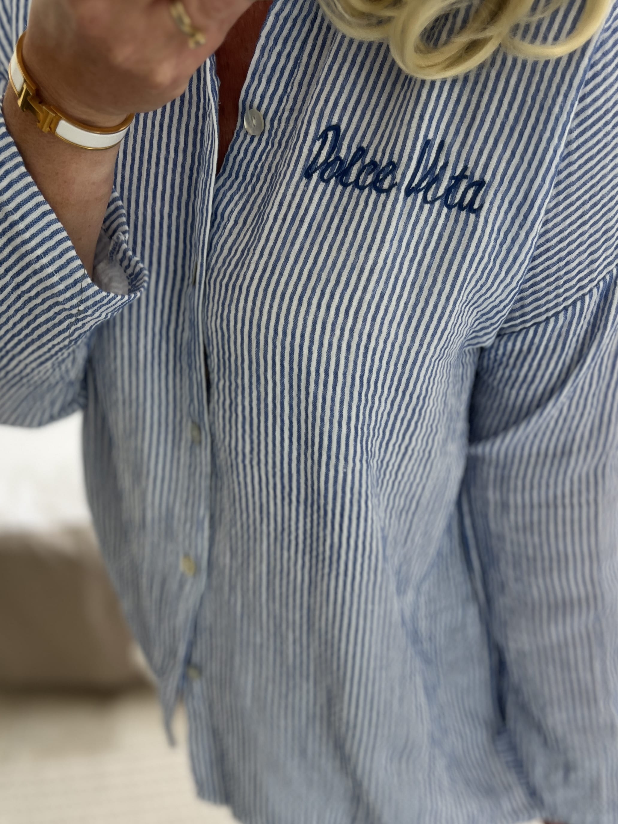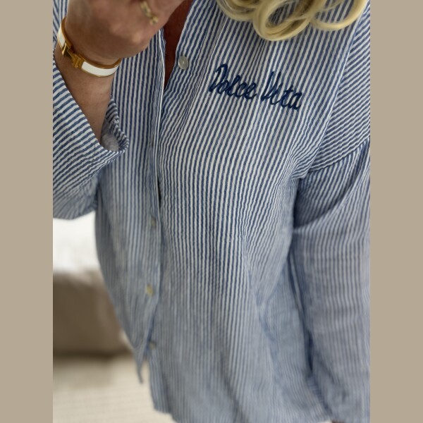 Détails : Chemise boutonnée à manches longues, coupe ample et décontractée. Réalisée en gaze de coton, un tissu léger, aéré et naturellement texturé, parfait pour les journées chaudes. Elle présente un motif à fines rayures verticales. Le col chemise est classique. Une broderie « Dolce Vita » en écriture manuscrite orne la poitrine gauche, ajoutant une touche de fantaisie chic.
