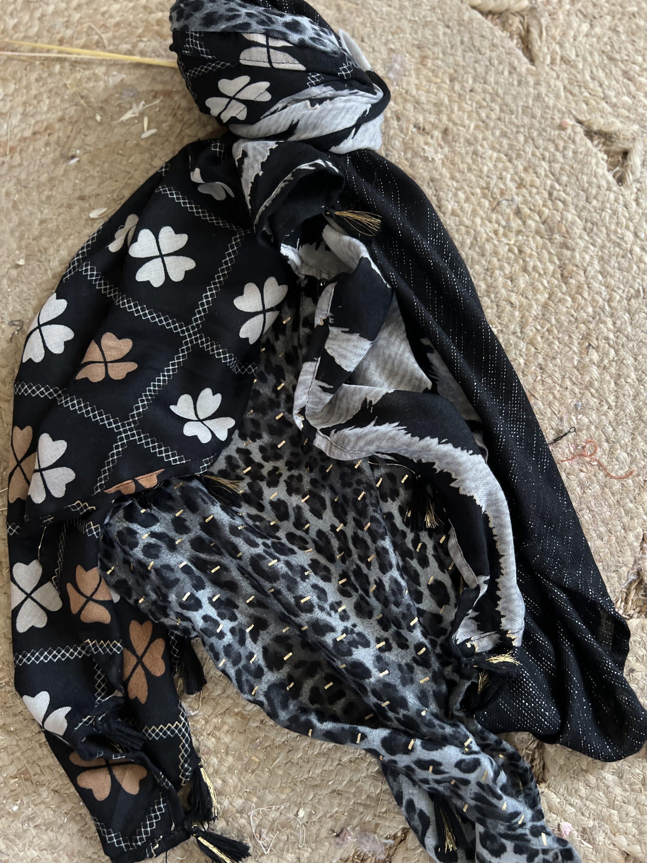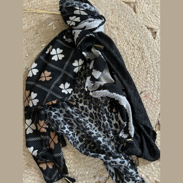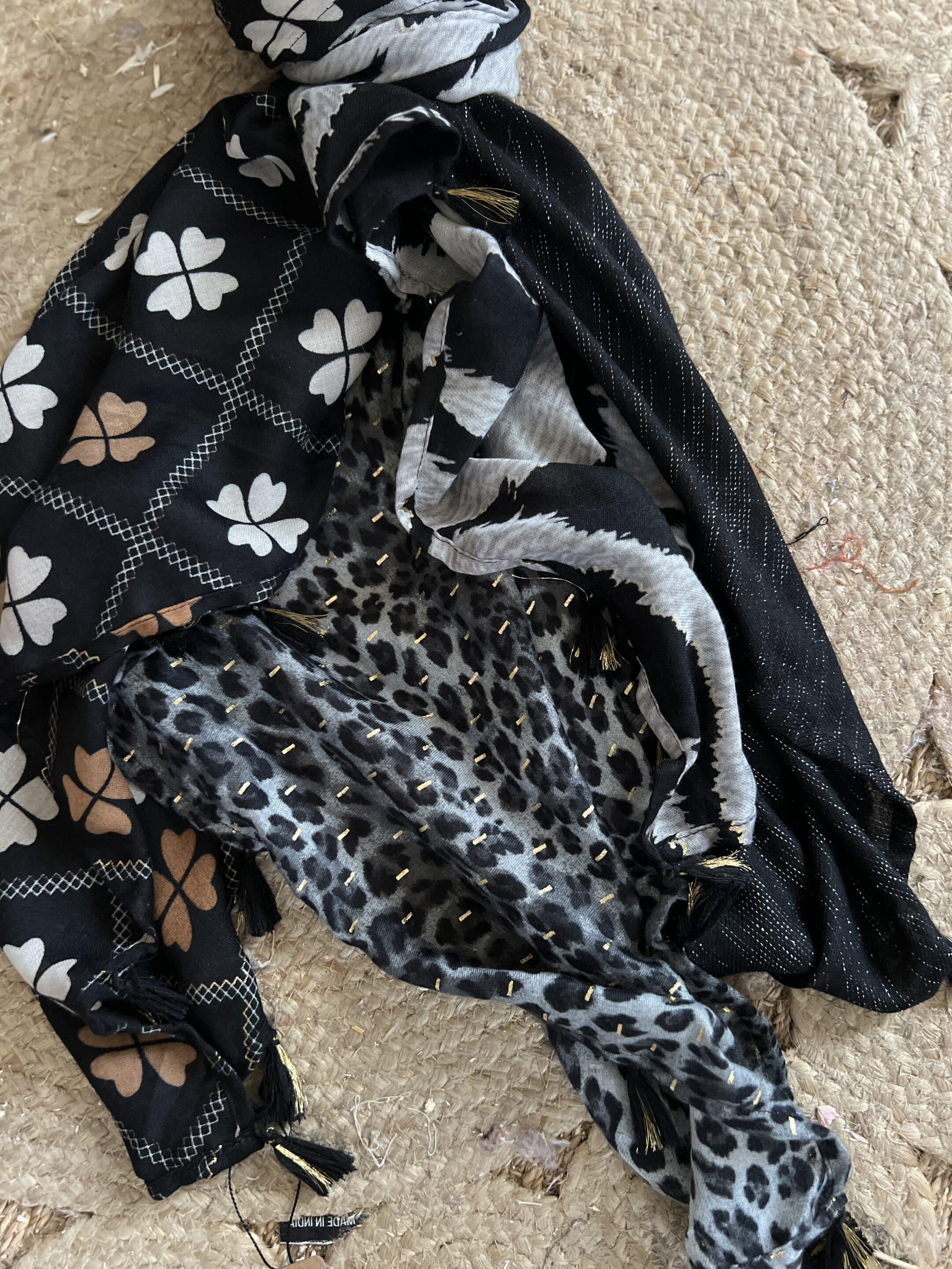 Echarpe Patch viscose pompons 4 carrés différents sur la même Echarpe