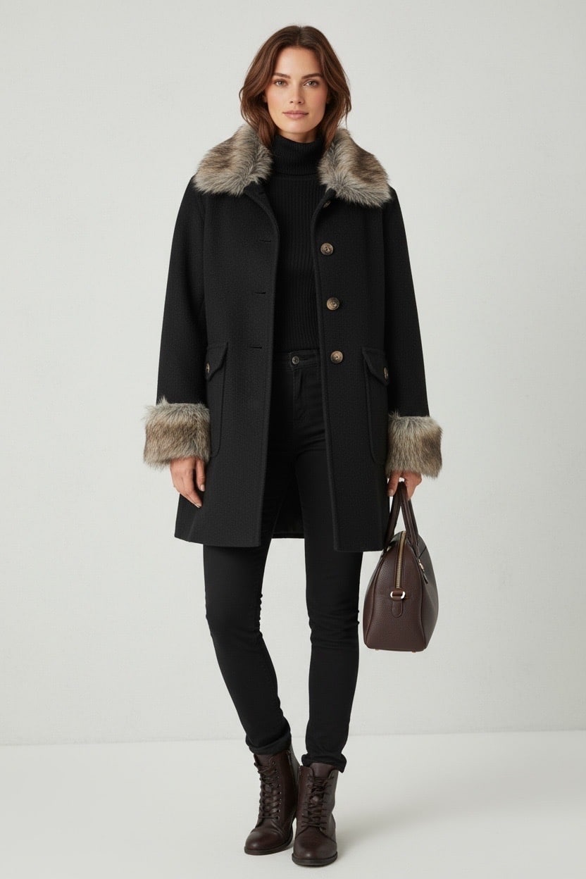 Le manteau Alaska allie chaleur et élégance avec son col et ses poignets bordés de fausse fourrure. Confectionné dans un mélange de laine et de polyester, il offre une texture douce et structurée. Sa coupe droite et ses poches à rabat en font une pièce intemporelle et raffinée pour l’hiver.