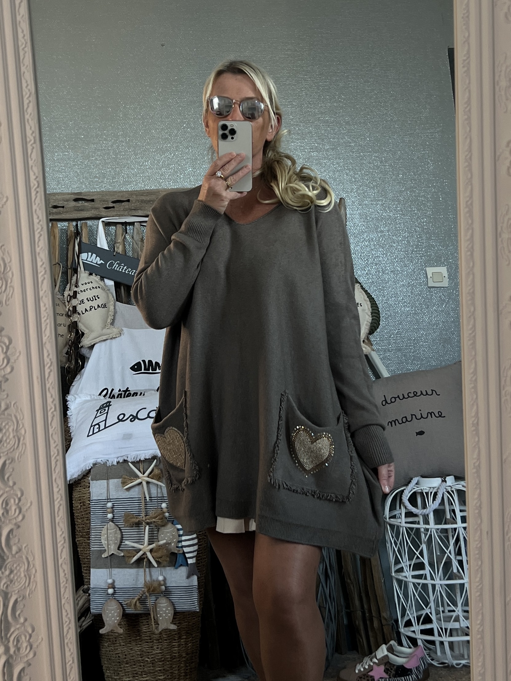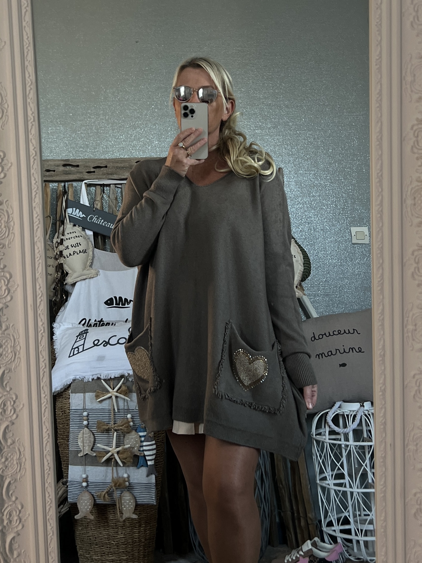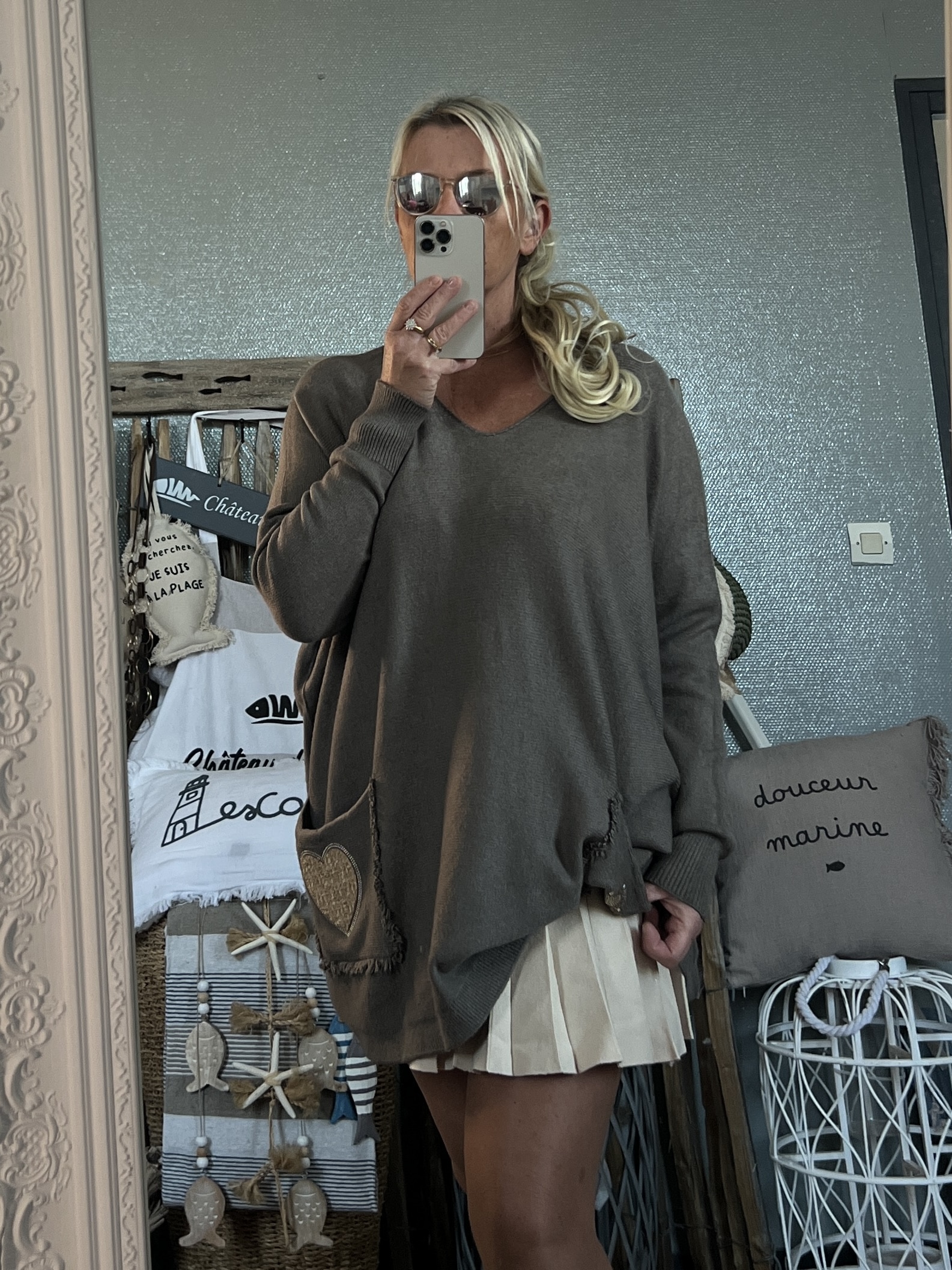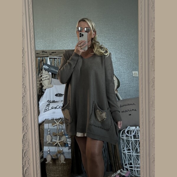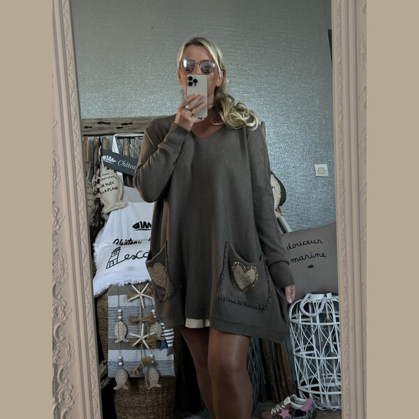 Pull coton viscose elathane taille unique 44/50 taupe poches strass