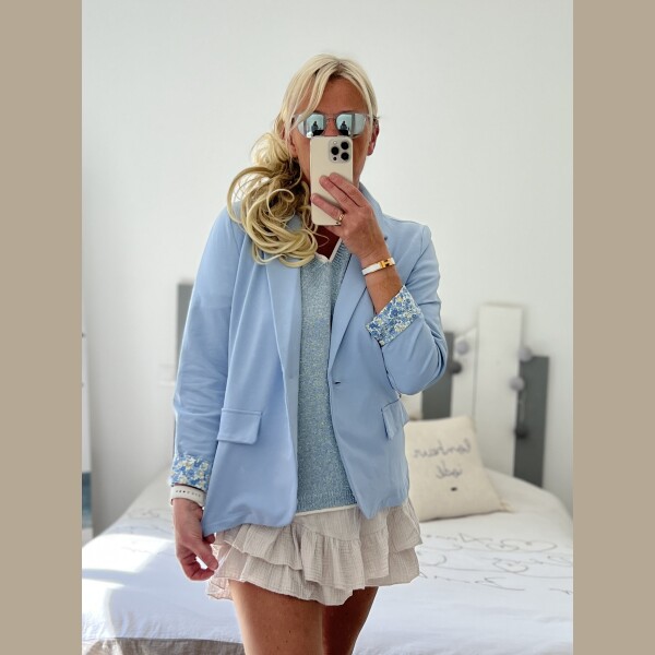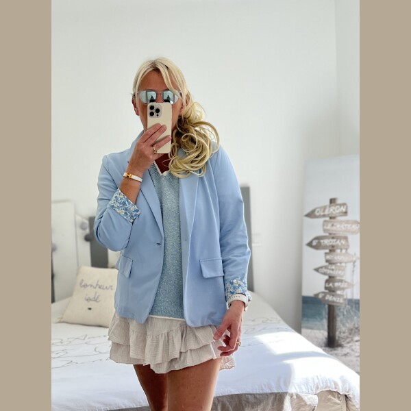 Veste Blazer en Coton Matière : 95% Coton. 5%Elasthanne Taille Unique (36-42). Détails : Coupe classique structurée avec col à revers, fermeture par un bouton unique assorti, deux poches latérales à rabat, et doublure fleurie délicate apparente aux poignets retroussés. Tissu respirant et confortable.